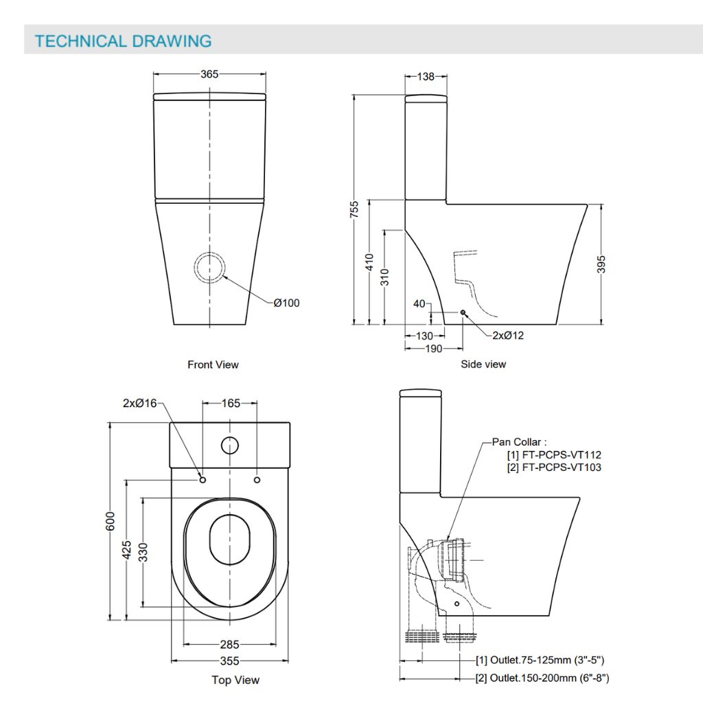 • Rough in (S-Trap) : 75-125mm (3’’-5’’) / 150-200mm (6’’-8’’)