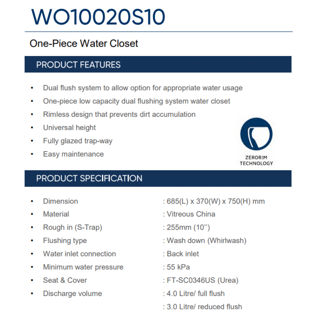 • One-piece low capacity dual flushing system water closet